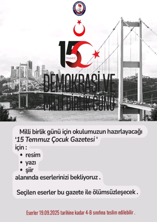 Sizde gazetemize katkı olmak istiyorsanız,eserlerinizi 19.09.2025 tarihine kadar 4-B sınıfı öğretmenimize teslim edebilirsiniz.